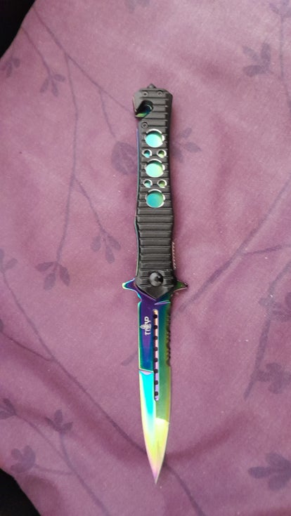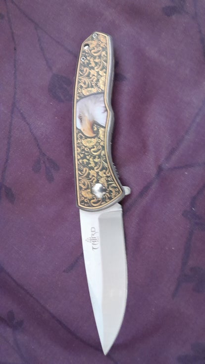 Joli couteau de collection manche nacré lame avec reflet verdatre.